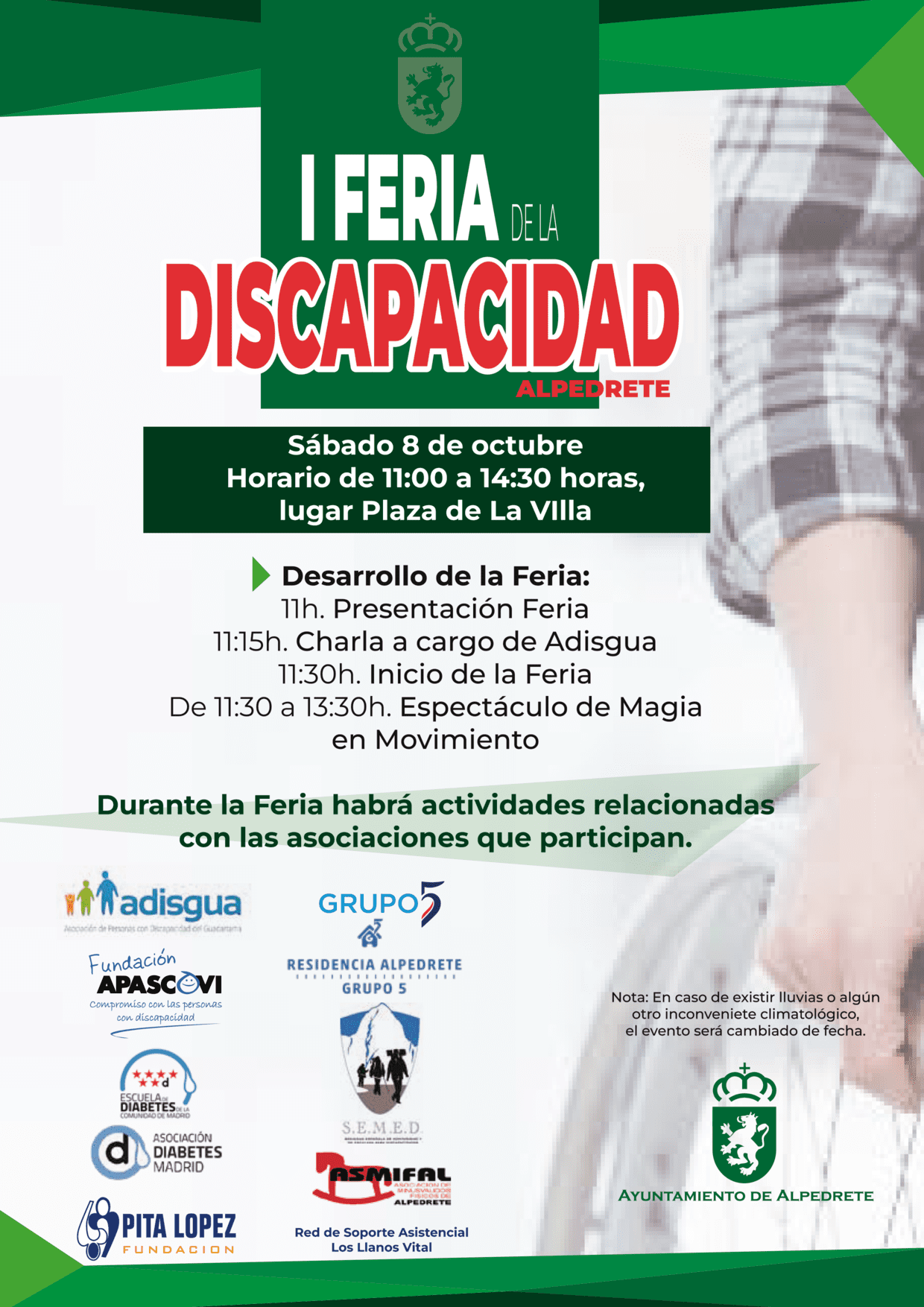 La Fundación APASCOVI participa mañana, sábado 8 de octubre, en la I Feria de la Discapacidad organizada por el Ayuntamiento de Alpedrete desde la Junta Local de la Discapacidad y la Concejalía de Servicios Sociales. El evento tendrá lugar en la Plaza de la Villa, entre las 11:00 y las 14:30 horas