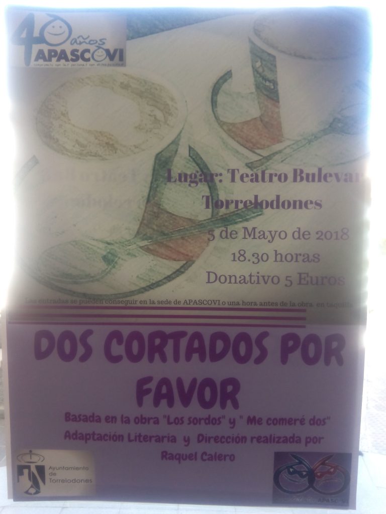 Dentro de la programación del 40 aniversario que está organizando APASCOVI, los chicos del grupo de teatro actuarán este sábado, 5 de mayo, en la Casa de Cultura de Torrelodones. La cita será a las 18.30 horas y en ella se podrá disfrutar del montaje “Dos cortados por favor”, basada en la obra “Los sordos” y “Me comeré dos”.
