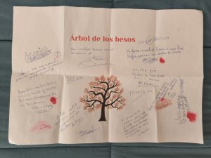 Como cierre, se creó un mural colectivo bajo el nombre de “el árbol de los besos”, en el que cada persona pudo dejar una dedicatoria o plasmar su huella con un beso, construyendo entre todos una obra cargada de significado y emoción.