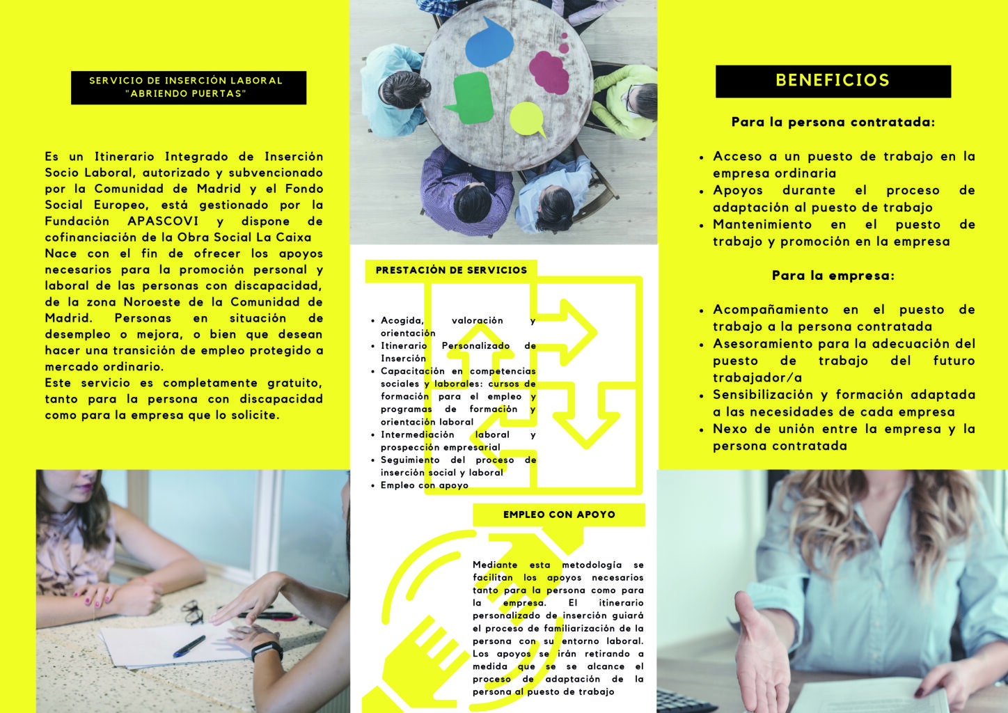 Abriendo Puertas nació con el fin de ofrecer los apoyos necesarios para la promoción personal y laboral de las personas con discapacidad de la zona noroeste de la Comunidad de Madrid, personas en situación de desempleo o mejora, o bien que desean hacer una transición de empleo protegido a mercado ordinario. Este servicio es completamente gratuito, tanto para la persona con discapacidad como para la empresa que lo solicite.