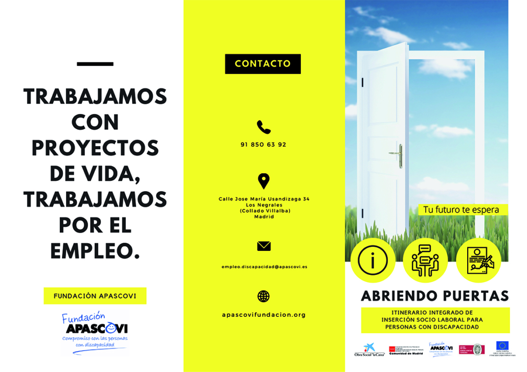 La Fundación APASCOVI, con la ayuda de la Comunidad de Madrid y Fondo Social Europeo, desarrolla otro año más el proyecto “Abriendo Puertas”, un Servicio de Empleo con Itinerarios Integrados de Inserción Sociolaboral para personas con discapacidad, cuyo propósito es aumentar la empleabilidad de sus participantes, dotándoles de las competencias necesarias para facilitar su inclusión en el mercado laboral.