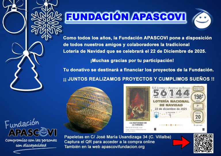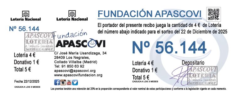 El 56.144: ese es el número de la Lotería de Navidad de APASCOVI 2025, que como cada año viene cargada con la esperanza e ilusión de que nos toque. Ya sabes que el donativo que recaudamos de las participaciones sirve para ayudar a financiar los proyectos que nuestra Fundación desarrolla en su importante labor social.